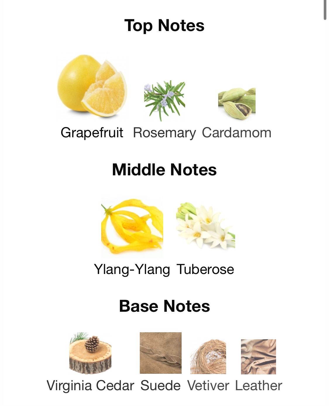 GRAPFRUIT, ROSEMARY, CARDAMOM, YLANG-YLANG, TUBEROSE, VIRGINIA CEDAR, SUEDE, VETIVER, LEATHER