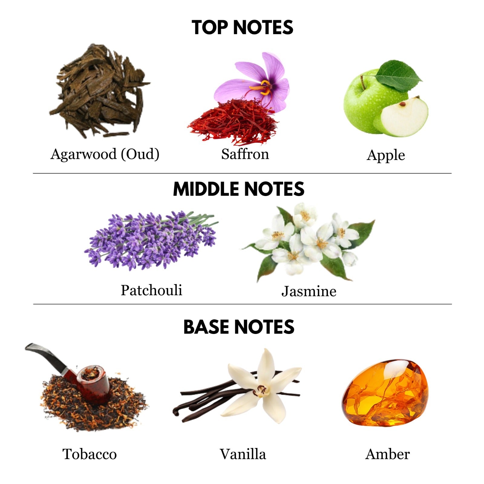 Cinnamon, Agarwood (OUD), Incense, Saffron, Nutmeg, Green Apple, White Pear -