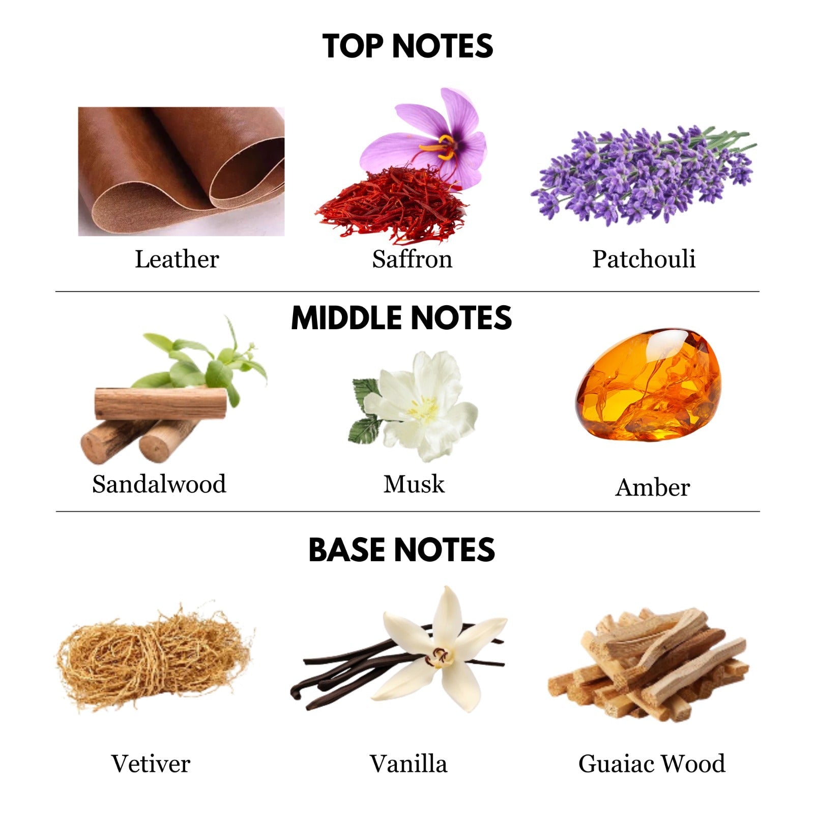 Leather, Agarwood(OUD), Patchouli, Guaiac Wood, Sandalwood, Musk, Vanilla, Tonka Bean, Vetiver, Benzoin